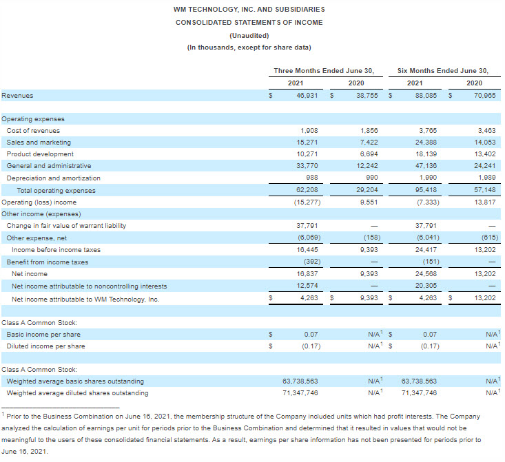 (6) Basic Net Income per share is only for Net Income attributable to controlling interests after the business combination (the “Business Combination”) on June 16, 2021 pursuant to that certain Agreement and Plan of Merger, dated December 10, 2020, by and among Silver Spike, Silver Spike Merger Sub LLC, WMH and Ghost Media Group, LLC.