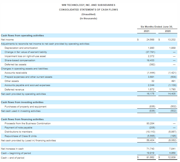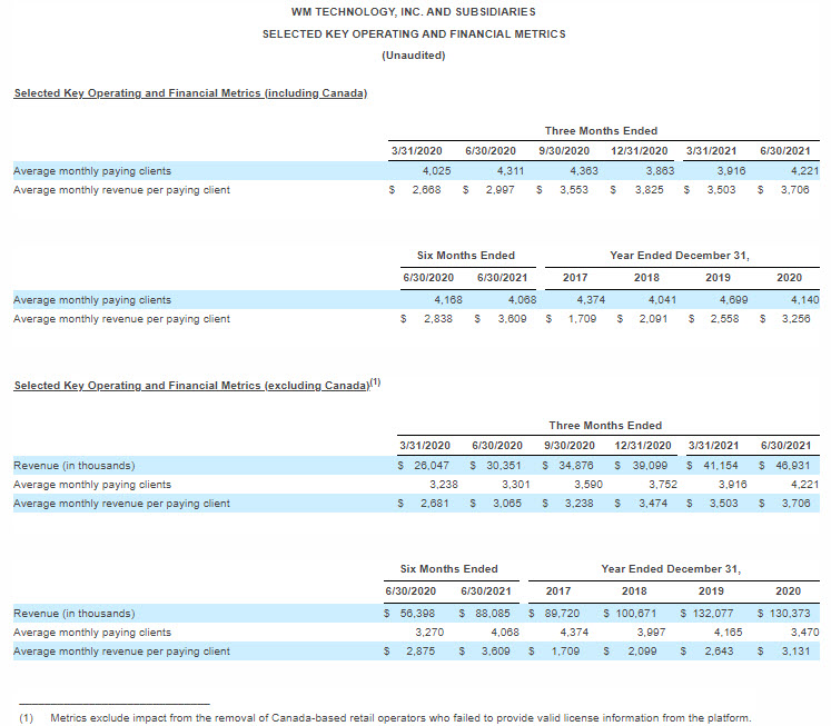Arden Lee, WM Technology’s CFO, added, “Our $47 million in second quarter revenue represents a 55% increase over the second quarter of last year, when adjusting the second quarter of last year to exclude revenue associated with Canada-based retail operators who failed to provide valid license information and were removed from the Weedmaps marketplace during the second half of 2020. Our results reflect double-digit year-over-year increases in both Average Monthly Revenue per Paying Client and Average Monthly Paying Clients using WM Business within our U.S. end-markets. We are investing heavily on multiple product-driven growth opportunities and new market openings for 2022 and beyond, while capitalizing on solid operating momentum across our existing end-markets. We continue to expect total revenue and adjusted EBITDA of $205 million and $50 million for 2021, consistent with our prior guidance.”