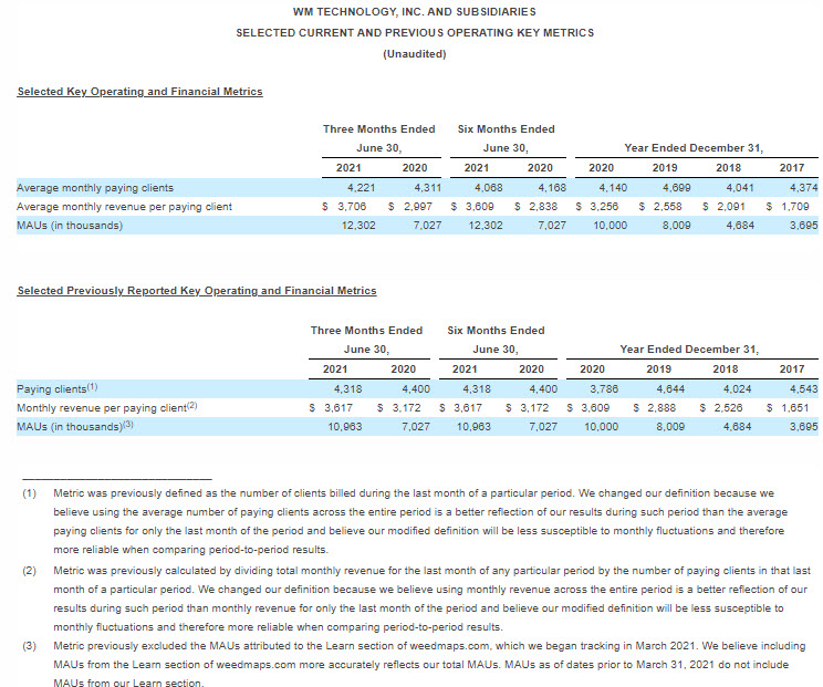 (2) MAUs are defined as the number of unique users opening our Weedmaps mobile app or accessing our Weedmaps.com website over the course of a calendar month. This metric previously excluded the MAUs attributed to the Learn section of weedmaps.com, which we began tracking in March 2021. See “Selected Current and Previous Operating Metrics” below for a description of how we used to calculate MAUs and what our MAUs would have been using our prior definition for the applicable periods.