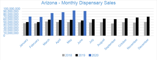 In June 2020, cannabis sales in Arizona’s medical dispensaries reached $91.3 million, declining two percent from May. Compared to the previous June, sales in Arizona grew by over 61 percent. Year-to-date through June, sales have reached $495 million, increasing by $161.3 million and 48 percent compared to the same period last year.