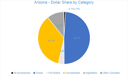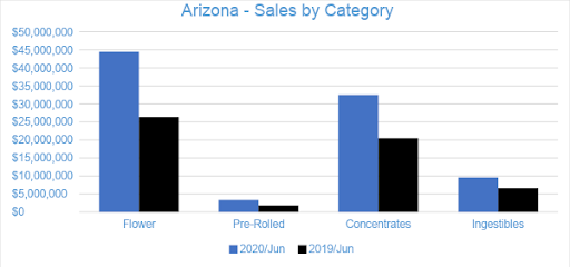Concentrate sales accounted for about 36 percent of overall revenues with sales totaling $32.5 million in June, remaining steady from the trailing month. Vape products, the largest segment of the Concentrates category, generated $20.6 million in sales, accounting for 64 percent of the Arizona Concentrates market and 23 percent of sales across all categories. Compared to June 2019, sales of Dabbable Concentrates grew by 98 percent, while Vape sales grew by 43 percent.