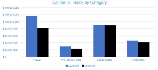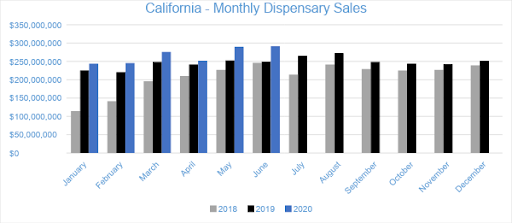 In June 2020, cannabis sales for state licensed retailers and delivery services reached $291.6 million, growing by less than one percent from the trailing month and 17 percent compared to June 2019. Year to date, sales in California have reached $1.6 billion, an 11 percent increase compared to the same period in 2019.
