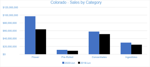 Flower sales accounted for nearly 52 percent of overall June 2020 sales. Sales in the category reached $34.6 million for the month, growing 15 percent from May. Pre-rolled Joints, tracked separately from Flower, accounted for more nearly 11 percent of June sales with $7.2 million in revenue. Compared to June 2019, Flower and Pre-rolled Joints sales have increased by 40 percent and decreased by ten percent, respectively.