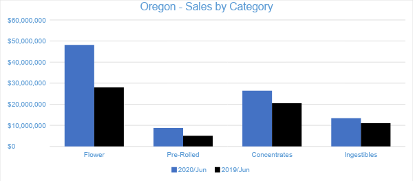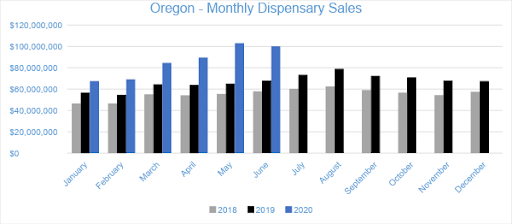 In June 2020, Cannabis sales in Oregon’s medical and adult-use dispensaries reached a combined $100.3 million. Compared to the trailing month, sales in the Oregon market decreased by about three percent. Compared to June 2019, sales grew by 47 percent overall. Year-to-date sales in Oregon have reached $514.3 million, growing by 38 percent compared to the same period in 2019.