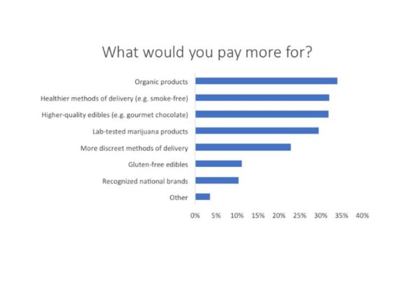 Consumers are most willing to pay more for marijuana products that do not negatively affect their health, such as those that are organic and which can be safely consumed. Secondary concerns include taste/quality, discretion and brand recognition.