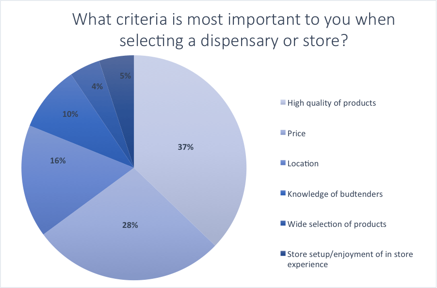High quality products are the most important priority for over a third of users, with price as well as convenience of location bearing great importance as well. Relatively few users (9%) chose knowledgeable budtenders as the most important criteria in selecting a dispensary.