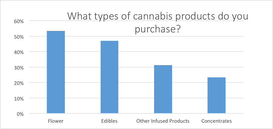 As dispensaries are considering their product selection, they should keep in mind the popularity of various categories of products. The growth of the legal market has allowed a more wide variety of cannabis products to flourish, but flower remains a top seller as many heavy users will purchase flower in addition to edibles, concentrates or other infused products. Among those surveyed, flower was still consumed by over 50% of respondents, followed closely by edibles with 47% of respondents indicating they consumed marijuana edibles on a regular basis. Smaller percentages of users indicated they used concentrates or other types of marijuana products such as topical creams or pills. However, as concentrates and other infused products are growing quickly in popularity much faster than edibles and flower, and we expect these categories to make up significantly bigger portions of the market in the coming years. It is important to note that many respondents purchase many different types of products, so they may use both flower and edibles or flower and concentrates on a regular basis.