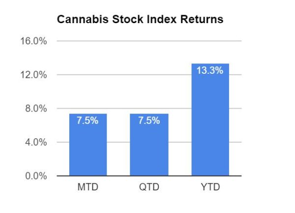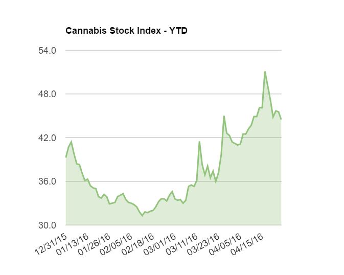 Two months ago, cannabis stocks, as measured by the 420 Investor Cannabis Stock Index, were down in the dumps. At their trough, the index, which currently has 27 members (based on a minimum price and minimum average daily value traded that were weighted equally at the last quarterly rebalancing on March 31), had declined by more than 20% from the year-end level. Now, the stocks are up more than 13% despite giving up a lot the gains since peaking at up 30.2% YTD on April 18th. That move represented a jump of 63% in just 9 weeks. Life in the market!