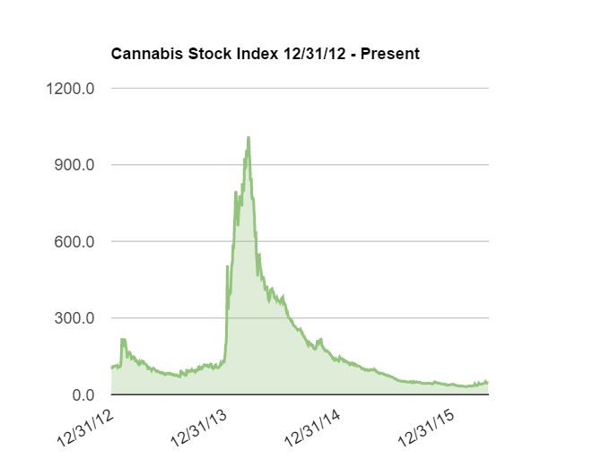 Cannabis stocks in their short history have a tendency of explosive rallies followed by protracted declines. In early 2013, they doubled very quickly before wiping out the entire rally and then some over the next six months. In early 2014, the index exploded as the doors to the retailers opened in Colorado. Quite simply, too many investors crowded into too few stocks, almost none of which were good deals even when the rally started. The index peaked at 1010, representing a gain of 535% in about 80 days. While the average stock rallied this much, it wasn’t uncommon to see some stocks that rose 2000-3000%.