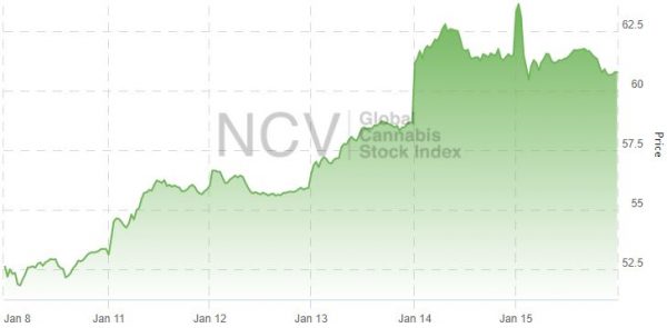The Global Cannabis Stock Index continued its torrid rally, increasing 13.9% to 60.79: