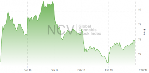The Global Cannabis Stock Index fell modestly in volatile trading, decreasing 1.1% to 76.07: