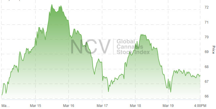 The Global Cannabis Stock Index retreated modestly after last week’s big gain, decreasing 2.8% to 67.55:
