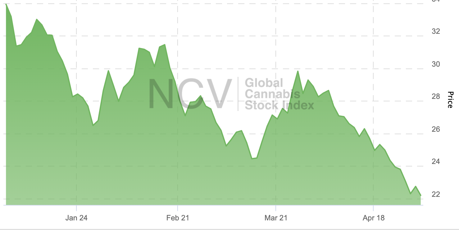 The Global Cannabis Stock Index retreated again, decreasing 7.2% to 22.20:
