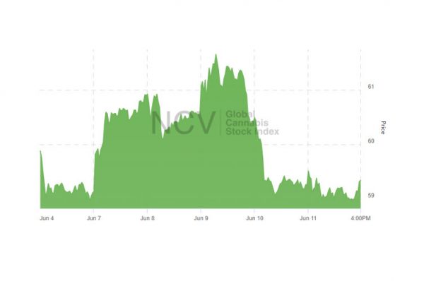 The Global Cannabis Stock Index tread water on little news this week, rising 0.4% to 59.34: