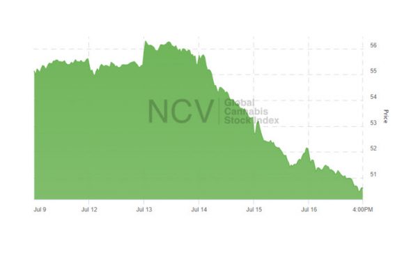The Global Cannabis Stock Index fell for the third consecutive week, losing 9.0% to 50.61: