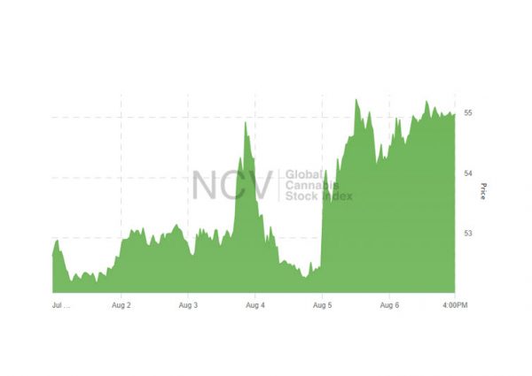 The Global Cannabis Stock Index endured mid-week volatility to score its third consecutive weekly gain, increasing 4.5% to 55.05:
