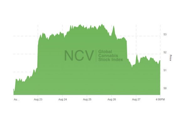 The Global Cannabis Stock Index recovered some of last week’s big losses, increasing 0.9% to 51.64:
