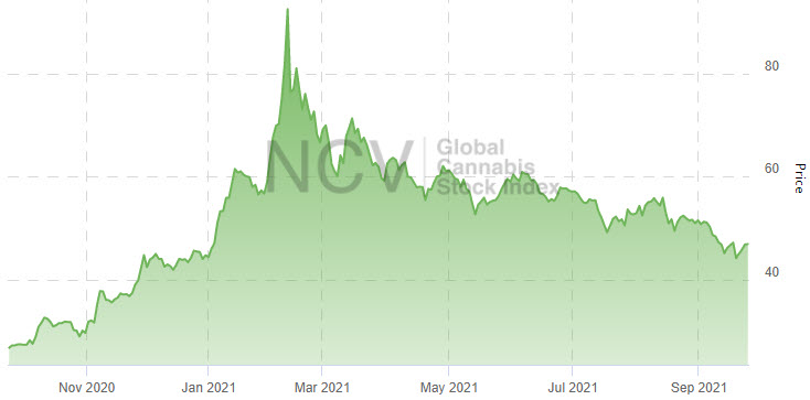 The Global Cannabis Stock Index recovered most of the massive losses from Monday that left the index down year-to-date but fell short of a weekly gain despite four straight subsequent increases, decreasing 0.6% to 46.91: