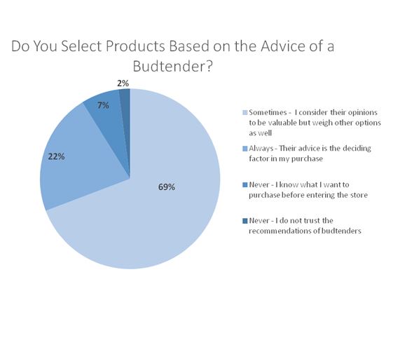 Interestingly, those who spend more per week on cannabis and consume more frequently have a higher opinion of the knowledge of their local budtenders and follow their recommendations more often. This is significant because in many markets as much as three quarters of sales come from heavy users.