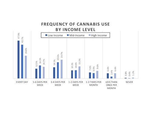 Nearly half (47.9%) of low-income consumers use marijuana every day, versus less than 30% of high-income consumers. This phenomenon may take place for several reasons, one being that low-income users – a majority of whom report being unemployed or unable to work full-time – can partake more freely in marijuana use outside of work hours than mid-career professionals who must be in the office 40+ hours per week. Another might be that those with more serious or debilitating medical conditions – and presumably generating less income –have greater and/or more frequent need for medication and are thus more prone to using daily. Regardless, using various tactics to appeal to the budget consumer market will give investors, manufacturers and dispensary owners access to a good deal of eager customers with a large appetite for product.