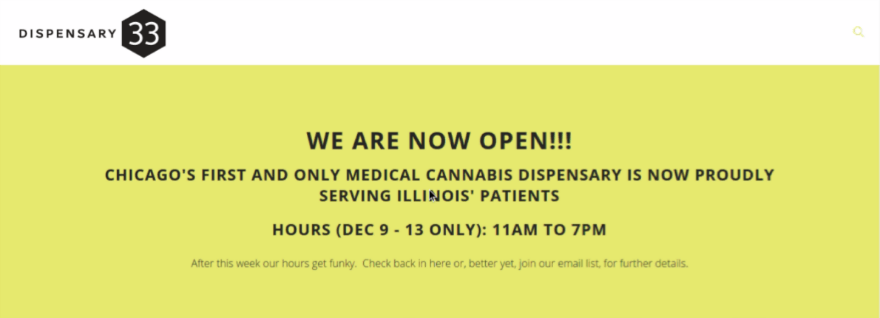 Dispensary 33 opened its doors today, making history as the first location in the city of Chicago where one could purchase cannabis legally (with a medical cannabis card issued by the state). Located at 5001 North Clark, the dispensary received its final license on November 19th. Owners Zach Zises and Paul Lee were interviewed last month on WGN radio that inspired listeners to literally pull over to the side of the road to call in. Zises handles the financial and compliance aspects of the business, while Lee manages the operations, deals with patients and handles product selection. The Chicago Sun-Times provided some details on the dispensary, which it said looked like an Apple store. For now, it is selling only dried flower provided by Nature’s Grace and Wellness in Vermont, Illinois, but it will begin to offer edibles and extracts in early 2016.
