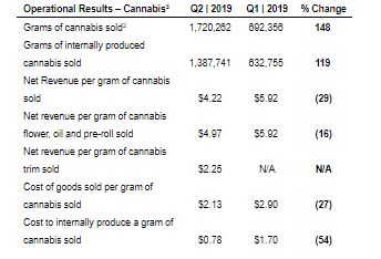 - In order to increase recreational cannabis market share, the Company reduced prices on sales to provincial counterparties in July 2019. This resulted in an approximate retroactive reduction of $790,000 in net revenue for the quarter;