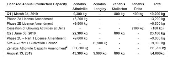 - A summary of the changes in Zenabis’ licensed annual production capacity between March 31, 2019 and August 13, 2019 is provided below