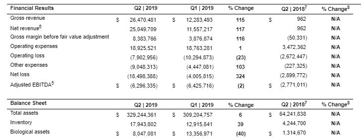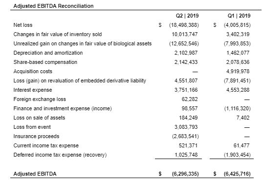 Adjusted EBITDA has continued to show a loss due primarily to the operational costs incurred by the Company to build out its operational capacity to achieve the planned design capacity of its various facilities. Adjusted EBITDA has remained consistent in comparison to the three months ended March 31, 2019 as it continues to have a loss due to the additional expenses which are offset by the increase in sales realized through the Company’s Cannabis and Propagation segments. Q2 2019 Adjusted EBITDA was ($6.3 million), compared to ($6.4 million) in Q1 2019.