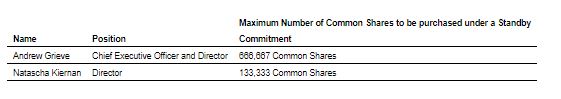 To the knowledge of the Company, after reasonable inquiry, the following directors, senior officers and persons controlling over 10% of the Common Shares of the Company (collectively, the “Insider Group”), as the date hereof, have committed or expressed their intention to participate in the Rights Offering as set out in the following table, subscribing in the aggregate for approximately 29.52% of the Common Shares available under the Rights Offering, being 41,059,486 Common Shares.