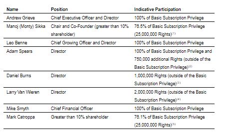 - Daniel Burns will not have a Basic Subscription Privilege, but intends on exercising 500,000 Rights transferred to him by Manoj (Monty) Sikka (who will not exercise such rights himself) and 500,000 Rights transferred to him by Mark Catroppa (who will not exercise such rights himself).