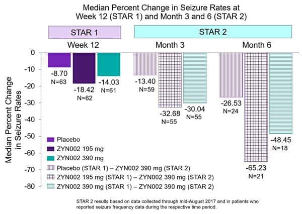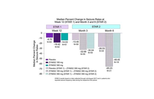 - Patients taking ZYN002 for nine months (three months during STAR 1 and six months in STAR 2) experienced a >65% (195 mg in STAR 1 and 390 mg in STAR 2) and >48% (390 mg in STAR 1 and STAR 2) median reduction in seizures from baseline.